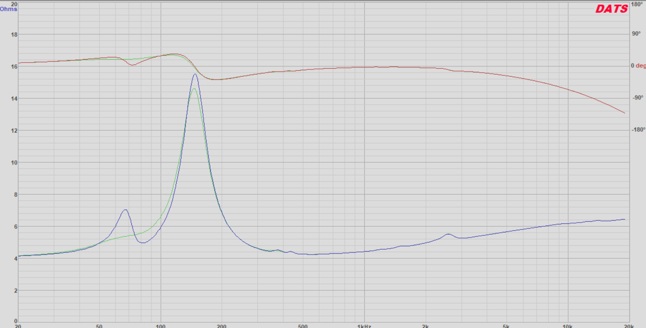 このチャンバーライン(そしてTDL市販スピーカーの最後のもの)がそうです。 菅野:なるほど、つまり「バスレフとλ/4共鳴管の挙動を示し、ラインの吸音材で低音の特性を調整できる」というものが伝統的なTLの形で、そして今回のチャンバー型TLもそれに当てはまるということですね。 この折れ曲がったラインは音響迷路として機能し、中域の漏れなどを減少させる効果もありそうですが… Dr.Scott:結果としてそういう効果もあるかもしれませんが、このラインはあくまで低域の特性を制御するためのものであり、 単に望ましくない反射による中域の漏れなどを取り除くために追加されるものではありません。 そして吸音材に位置についてですが、粒子速度が最大となる(空気が最も大きく動く)ラインの出口に配置すると最も効果的です。 菅野:よくわかりました。スコット博士が以前にOM-MF5用に設計された同じようなTLエンクロージャーのインピーダンス特性を測定してみました。 青線がラインの吸音材なし、緑線がラインの吸音材ありの特性です。 この特性から考えると、吸音材が少なければバスレフやλ/4共鳴管の特徴が多く現れ、吸音材が多ければ密閉型の特性に近づくように思えます。 Dr.Scott:はい、吸音材と挙動の関係は多かれ少なかれその通りです。ダンピングを大きくすると、ラインからの出力が徐々に減衰し、特に低域においてインピーダンスカーブも平坦になります。この現象は緑のカーブで見ることができますね。 また、上側のピークが減少し始め、ごくわずかに低い周波数にシフトし、330Hzから500Hzの間の小さなパイプ共振も平坦化されています。 ラインのダンピング量を増やすと、徐々にクリティカルダンピング(インピーダンスが最大に平坦になること)に移行します。 しかし、吸音材をたくさん詰めたからといって、密閉型と同じような挙動を示すわけではありません。 菅野:インピーダンス特性を測定したとしても、その挙動を完全に理解できるわけではないということですね。 Dr.Scott:そうなんです。共振周波数付近の2つのインピーダンスピークは、実は、なんらかの通気孔のあるエンクロージャーの特徴であり、それがλ/4共鳴管(TLとバックロードホーン)であろうとヘルムホルツ共鳴(バスレフ)であろうと関係なく、すべてそのような特性を示し、互いに何らかの関係があるのです。もちろん、λ/4共鳴管のボックスはパイプの高調波モードが減衰されないと、インピーダンス曲線に、さらなるピークを示すことになります。その共鳴をどうコントロールするかは、設計者次第です。