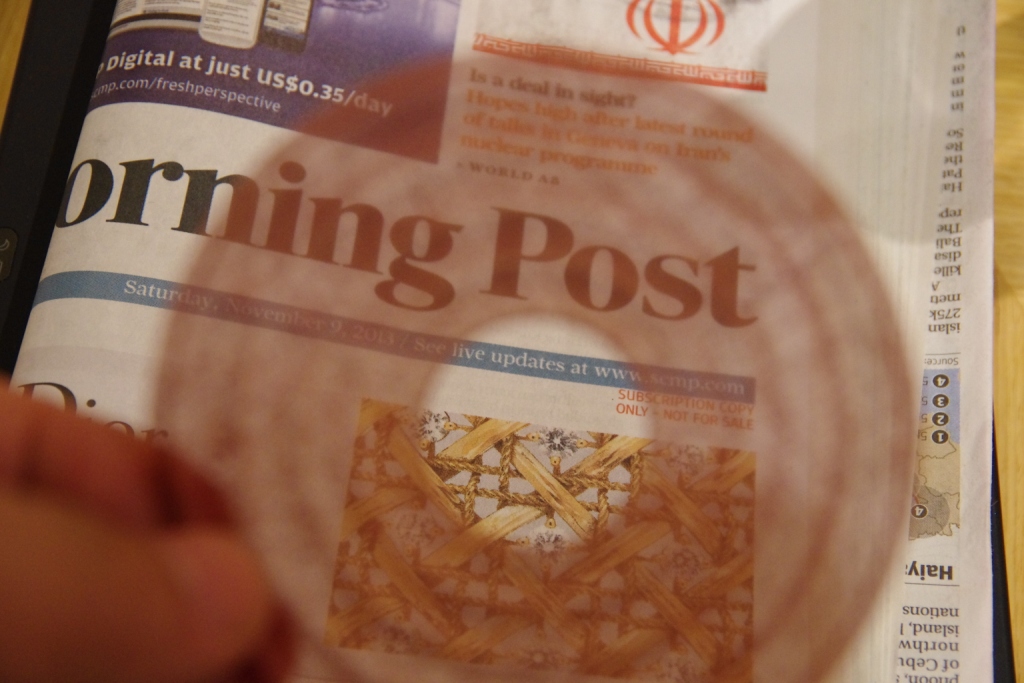 左はこの薄い膜の様なスパイダーを通して見た英字新聞です。小さなフォントまでクリアーに見えると言う驚きのスパイダーです。。