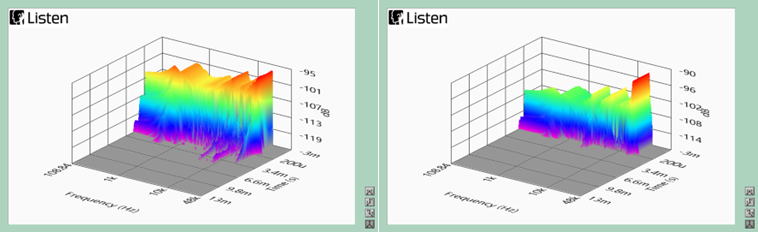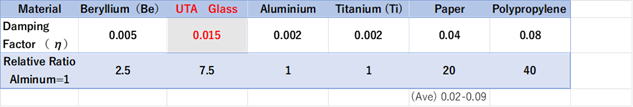 上の図はUTAガラスを使用した減衰特性とポリメタクリルイミド(PMI)フォーム(減衰係数が比較近い素材)との比較です。UTAガラスは全ての周波数帯域で減衰時間が見事にフラットです。単に減衰力のみではなく、全音楽帯域で綺麗に同じ様に減衰することを証明していいます。これは、Alpair5Gの再生は色付けが非常に少ない事の裏付けになります。