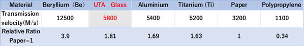 スピーカーの再生音の基本特性の音のスピード感、音のキレはこの要素で決まります。 測定値はチタンよりもアルミニウムよりも速く、何とペーパーコーンの1.8倍という数値はピアノタッチやシンバルの再生音に理想的です